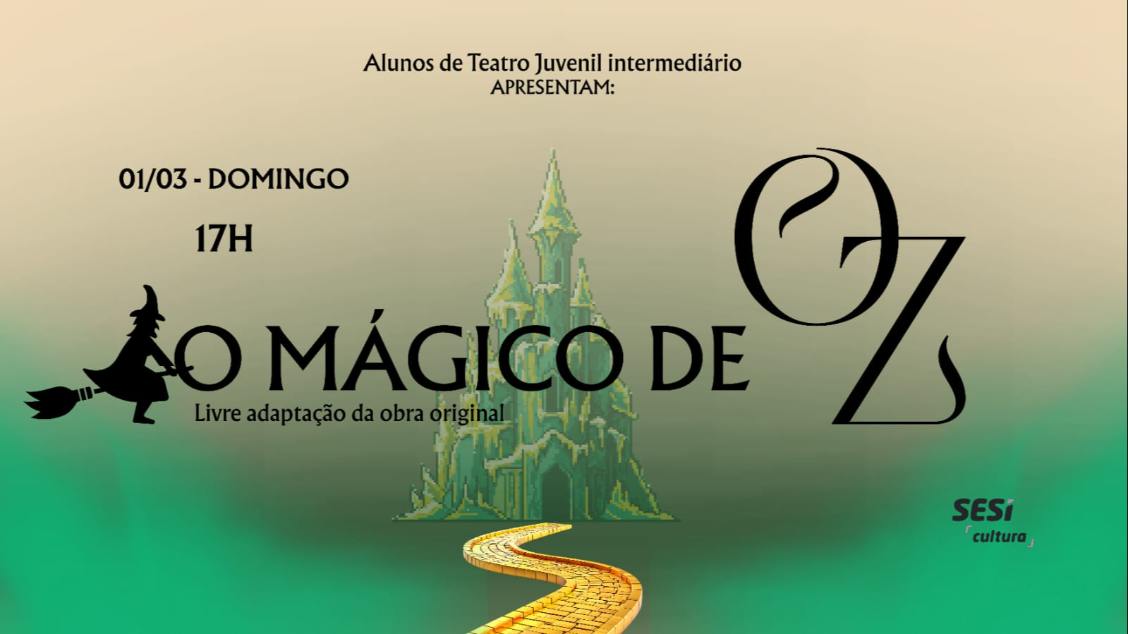 A turma Juvenil Intermediário do Centro Cultural Sesiminas Uberaba apresenta uma adaptação do clássico “O Mágico de Oz”, que acompanha a jornada de Dorothy por uma terra fantástica após ser levada por um ciclone. Em seu caminho pela estrada de tijolos amarelos, ela encontra o Espantalho, o Homem de Lata e o Leão Covarde, que seguem juntos em busca do misterioso Mágico de Oz. Com humor delicado e linguagem acessível, o espetáculo convida o público a refletir sobre amizade, coragem, sensibilidade e o desejo de encontrar seu próprio lugar no mundo.