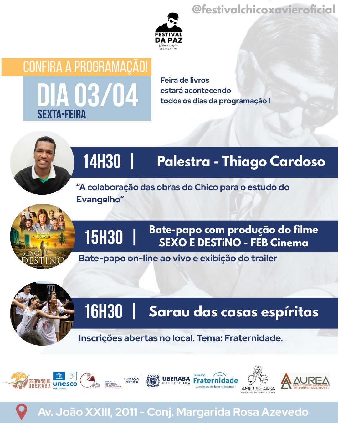 De 2 a 5 de abril, o Memorial Chico Xavier recebe o Festival da Paz, uma realização da Fundação Cultural de Uberaba Professor Antônio Carlos Marques, AME e Geoparque Uberaba, em celebração ao aniversário do médium que marcou a história da cidade.